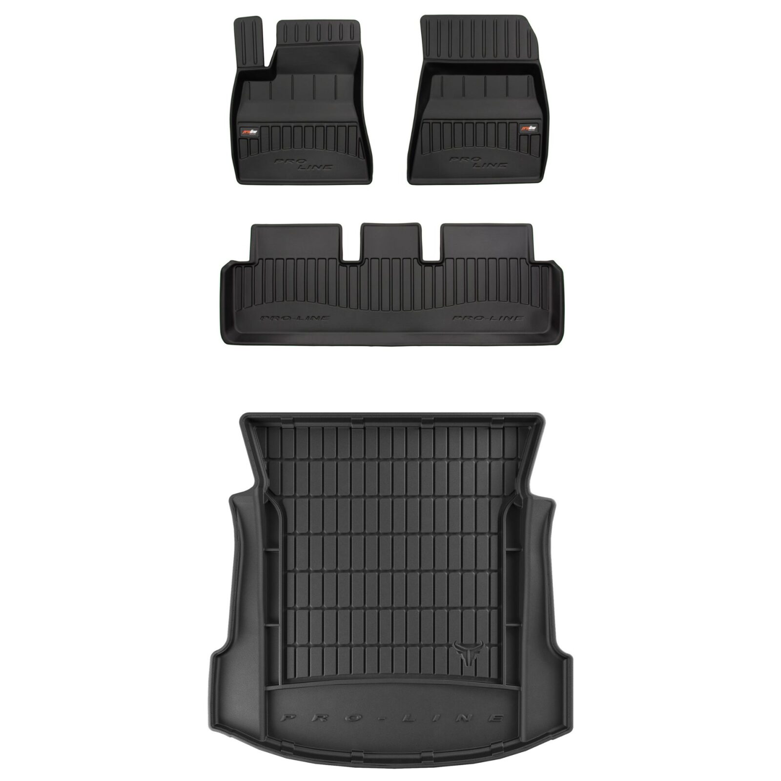 Zestaw dywaników samochodowych i maty do bagażnika ProLine dopasowany do Tesla Model 3 (2017-2023, wersja przed liftem, sedan, z wyłączeniem wersji z pompą ciepła, tylny bagażnik, górna podłoga bagażnika)