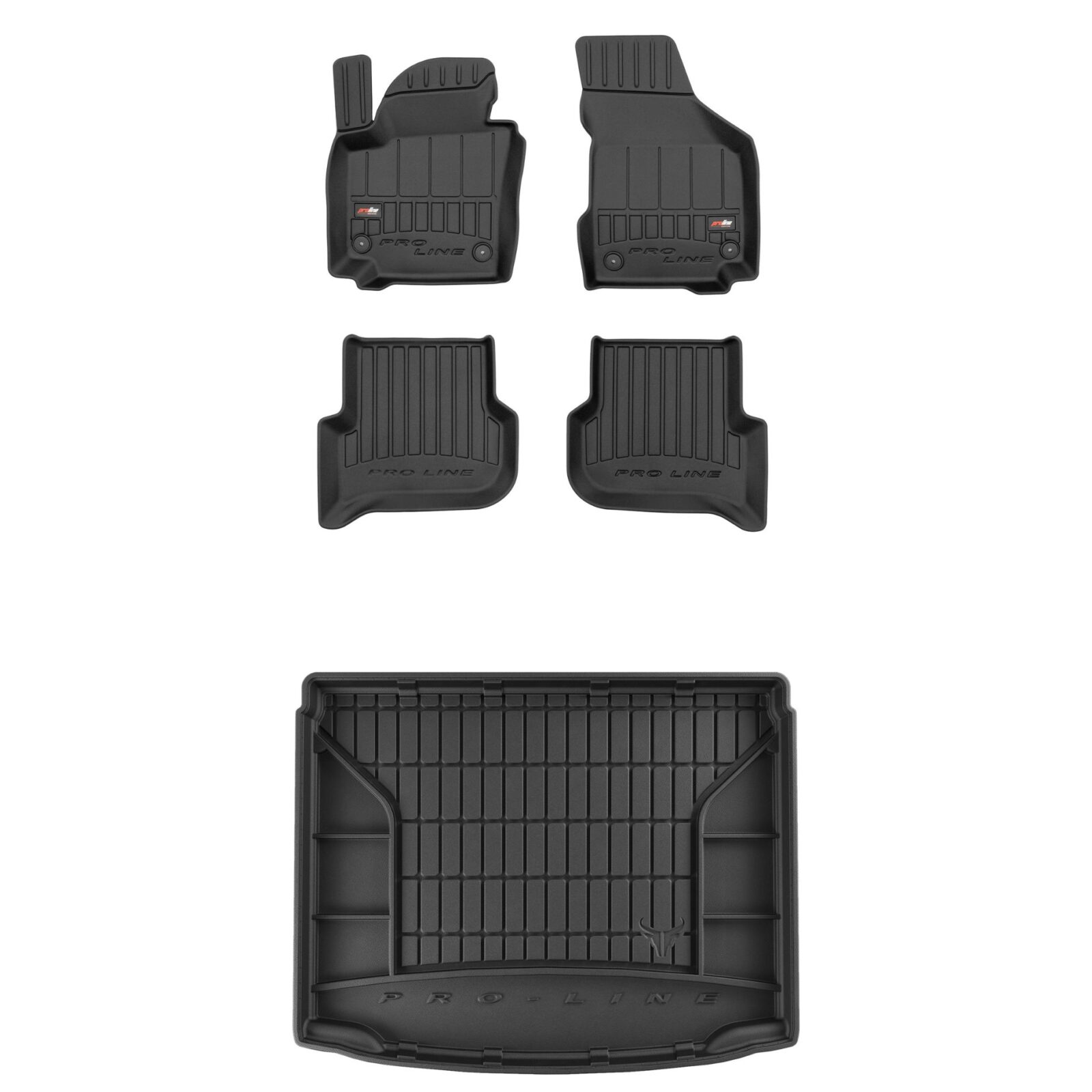 Zestaw dywaników samochodowych i maty do bagażnika ProLine dopasowany do Volkswagen Golf Plus (2005-2014, minivan, bez regulowanej wysokości podłogi bagażnika, z organizerem bagażnika, dystans między stoperami w dywaniku kierowcy 31,5cm i pasażera 30,4cm)